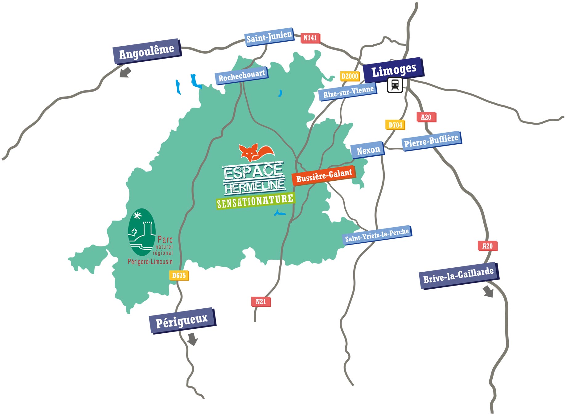 From highway A20 : take the exit Pierre-Buffière, direction Nexon - Les Cars - Bussière-Galant