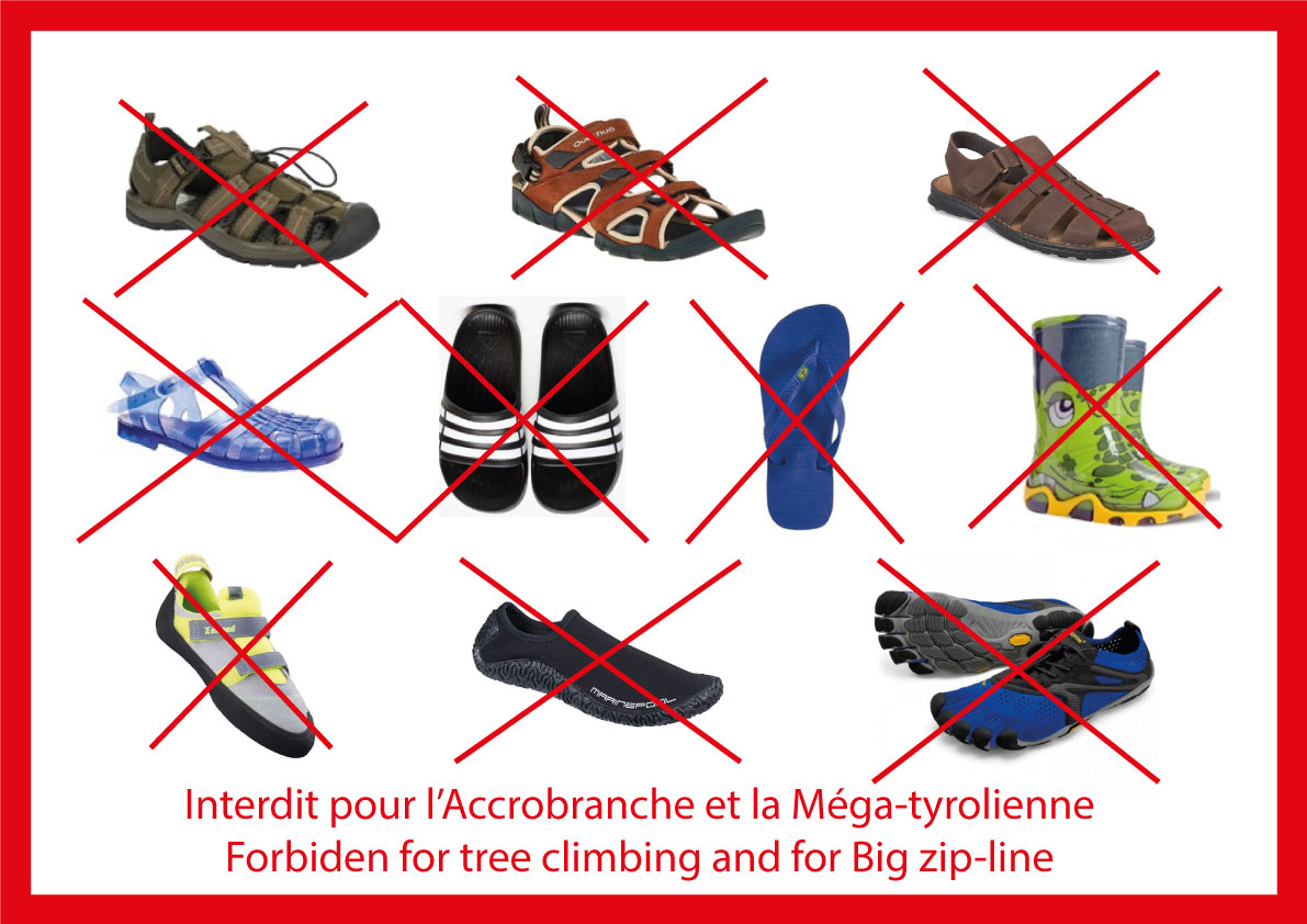 Le parc aventure est considéré comme une activité sportive avec des risques de traumatismes au niveau des pieds et des chevilles, c’est pourquoi nous demandons des chaussures conformes à la pratique d’activités sportives.